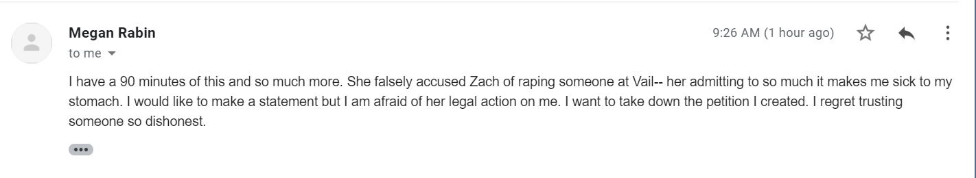 Attached to the emails were short audio clips of Ms. Waterbury talking over the phone about the potential of a monetary reward if they win the lawsuit. I found this email interesting for a couple of reasons: The first is that these quotes had already been made public, and Ms. Waterbury confirmed the reasons why she said them. I laid all of that out here. Secondly, the email had apparently come from Megan Rabin, the woman who had started the Change.org petition calling for Mr. Ramasar’s removal from the show.