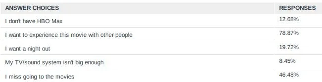 However, we asked why respondents wanted to see the movie in the theater, and the #1 reason (by far) was to experience this with other people (79% of all answers). After avoiding contact with fellow musical fans for a year, this looks to be a great movie to get back into the theaters for!
