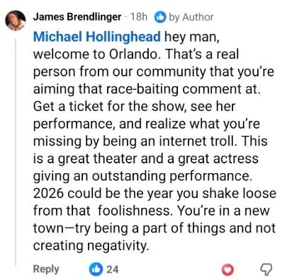 He shares “hey man, welcome to Orlando” (speaking to the troll cowering on the couch in the comfort of his mother's basement that was writing the sly “Is this the DEI version?” comment.) “That’s a real person from our community that you’re aiming that race-baiting comment at. Get a ticket for the show, see her performance, and realize what you’re missing by being an internet troll. This is a great theater and a great actress giving an outstanding performance. 2026 could be the year you shake loose from that foolishness. You’re in a new town–try being apart of things and not creating negativity.”
