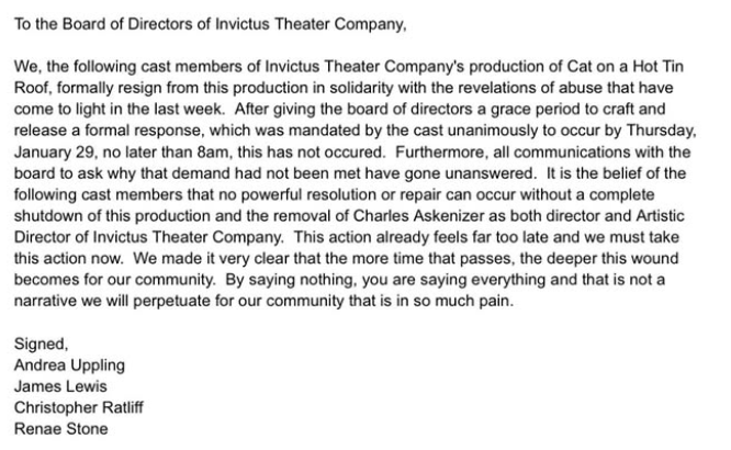 Multiple cast members of Invictus Theatre Company’s upcoming production of Cat on a Hot Tin Roof have resigned in the midst of rehearsals, citing newly surfaced allegations of abuse involving the show’s director and the company’s artistic director, Charles Askenaizer.